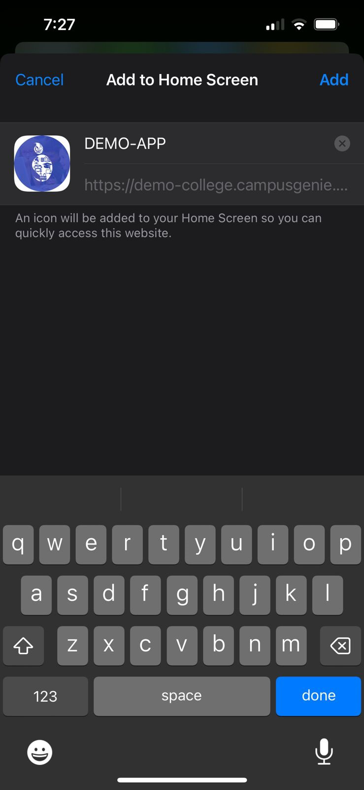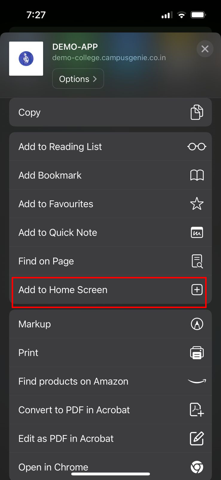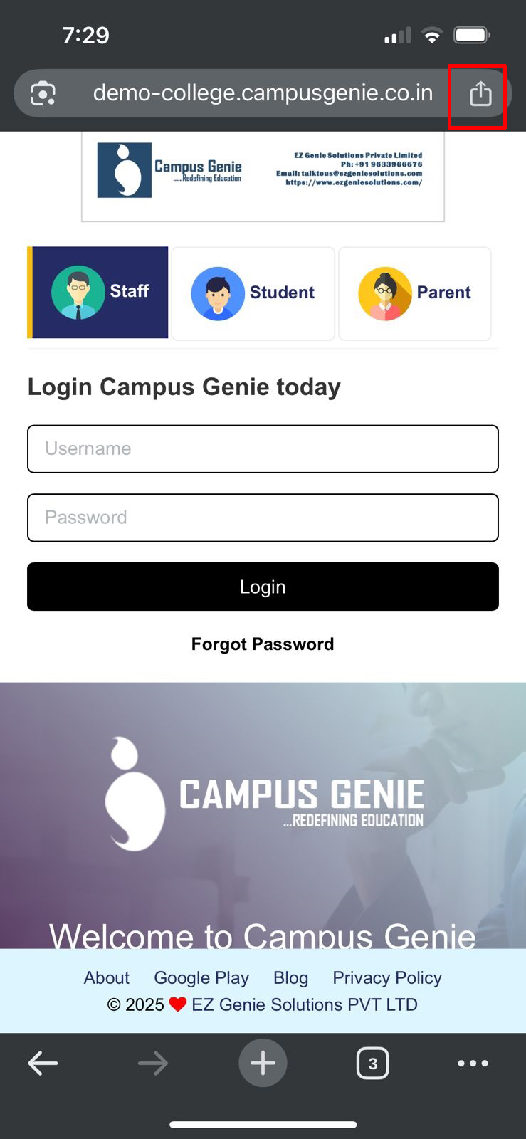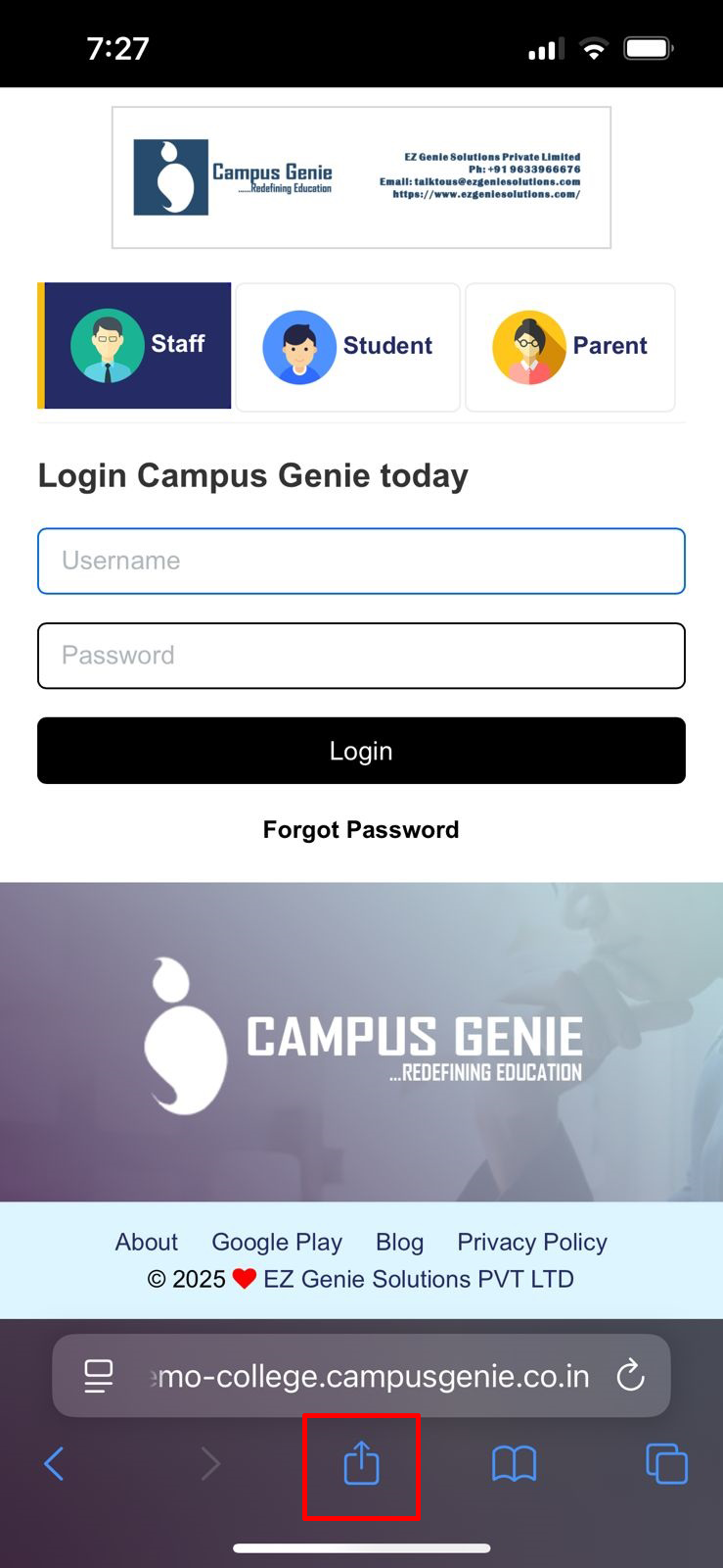 Safari browser on your mobile and type your campus url (https://sdc.campusgenie.co.in) in the search bar, and click on the share icon
